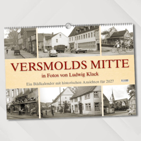 Der historische Kalender von Versmold für 2027 zeigt eindrucksvoll das Leben in der Stadt:Straßenzüge, Bauwerke, die z.T. schon verschwunden sind, die Menschen dort auf ihrem Weg, Kinder mit Fahrrädern, die ersten Autos auf Kopfsteinpflaster und einiges mehr. Die Aufnahmen des Fotografen Ludwig Klack zeugen von einem Gespür für das Besondere im Alltäglichen. Der Wandkalender ist im DIN A3 Format erhältlich.